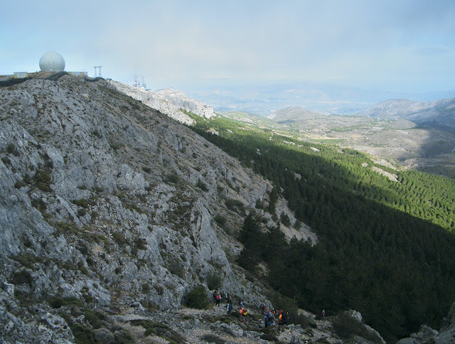 Un hito formado con piedras, marca la cima suplente de Aitana, ya que el verdadero vértice geodésico se encuentra dentro del perímetro protegido por una alambrada que rodea la base militar. Anduve oteando con el zoom de la cámara por si veía algo o alguien a lo que echarle el ojo y puedo afirmar que aquella mañana podríamos haber conquistado la auténtica cima (1557m) pues sospecho que nadie nos lo hubiera impedido, ya que no se atisbaba, salvo nosotros, a cristiano o militar en muchos kilómetros a la redonda.
