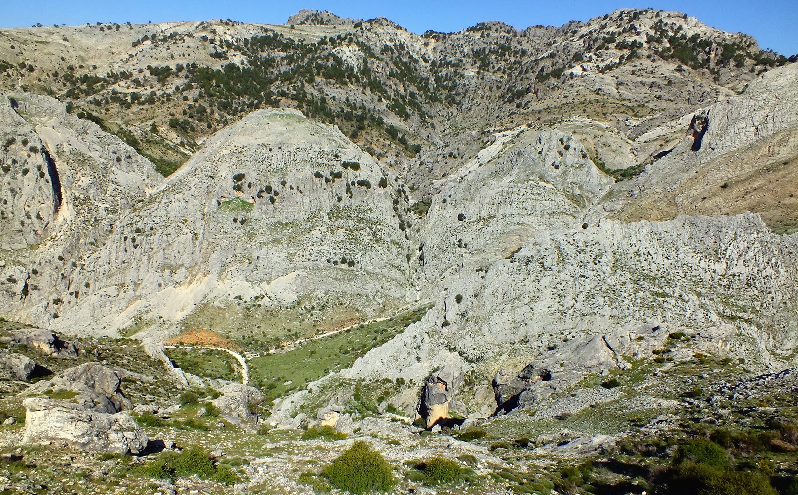 Continuamos ascendiendo por este buen sendero señalizado y pronto alcanzamos un collado desde el que llaneamos para divisar el barranco de Marfil, así como a los cerros del Caballo y las Buitreras (puntos estrella de la ruta), que desde nuestra posición, se muestran desafiantes y espectaculares con sus imponentes crestas calizas. También damos vista hacia la umbría del Tornajuelos, cima emblemática de Sierra Seca.