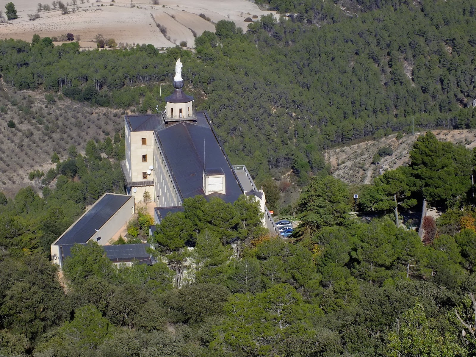El denso bosque de pinos y carrascas que conforman el paraje de la Font Roja es extenso. Estupendo lugar para pasar el día en familia, idóneo para visitarlo con niños, entretenidos con diversas actividades en saludable contacto con la naturaleza. Además de los motivos religiosos que en todo santuario suelen ser habituales, el entorno cuenta con mucho espacio de sombra amén de múltiples merenderos para practicar un picnic. En el momento de nuestra visita, reinaba gran algarabía en la zona pues no menos de cuatro autobuses de escolares permanecían estacionados en lugar habilitado para ello, lo que da idea de la cantidad de peregrinos ruidosos que pululaban por doquier.