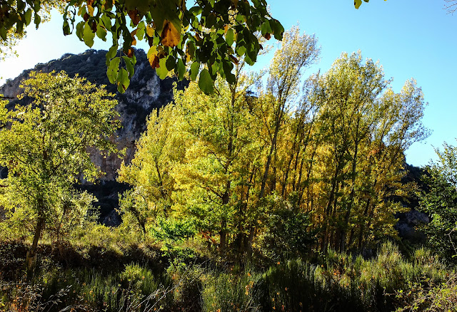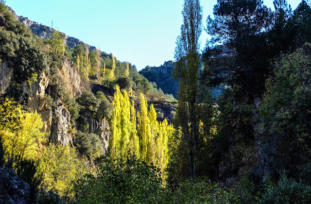 Regresamos por la preciosa pista que ya anduvimos a la ida, que paulatinamente se estrecha hasta convertirse en una senda que va ascendiendo por la margen derecha del río Segura. El valle se encajona, siendo flanqueado por perpendiculares paredones, rematados en escarpadas laderas, sembradas estas de carrascas. Pronto llegamos a un tramo de fuerte pendiente, que transita en umbría, (¡menos mal!) donde hay que apretarse los machos durante tres o cuatro cientos metros. Al final del repecho obtendremos nuestra recompensa, alcanzando un precioso mirador con vistas a una clásica fotografía de este bonito rincón jienense, cuando un plantel de espigados chopos, se exhiben aquí en plena efervescencia, en radiante esplendor otoñal. Desde la interpretación humana, puede parecer a simple vista un oxímoron, pero la naturaleza y belleza que le es intrínseca, se encargan a menudo de demostrarnos que el otoño no tiene por qué ser sinónimo de decadencia, al menos en el sentido espiritual y hasta incluso estético del término, sino que se produce un cambio de estación, de pigmentación, una mudanza existencial que tal vez sea para mejor. Otra cosa es la inexorable degeneración de las rodillas, que sobre esta cuestión, no hay tu tía😃.