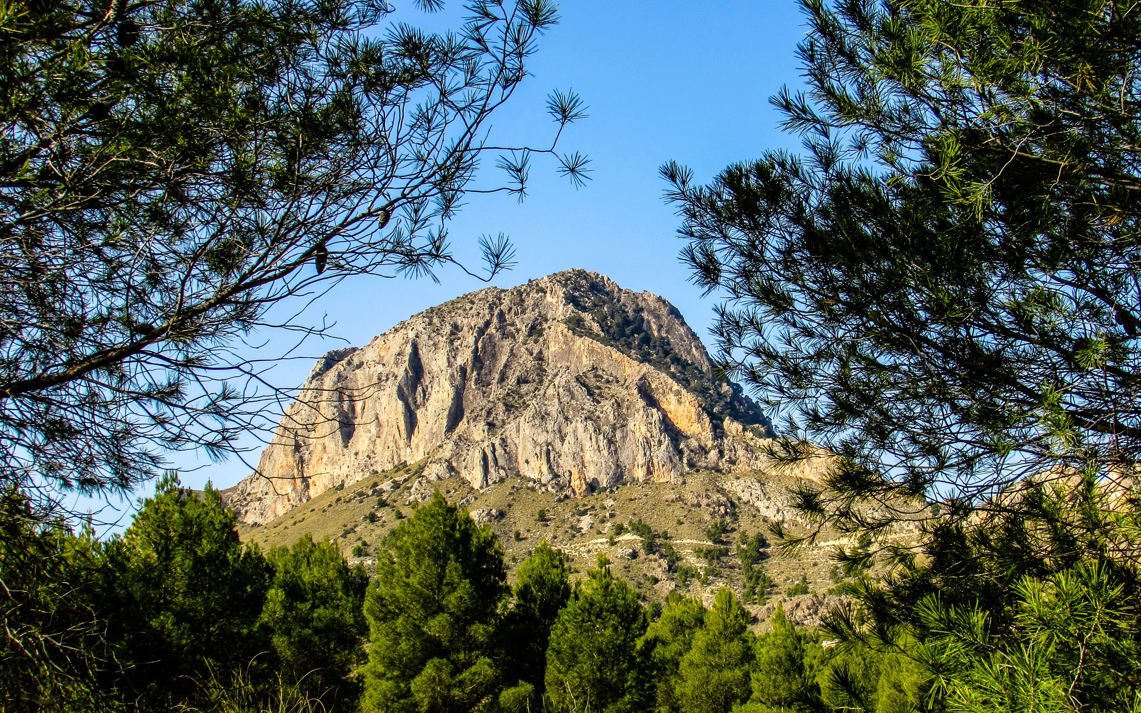 Se puede decir que al descubrir la vertiente sur del cerro Almorchón, quedé hipnotizado, embrujado, fascinado por ese grandioso porte dolomítico que muestra. Confieso sentir una atracción especial por esta montaña, cuya silueta, nunca me canso de admirar. Me parece bellísima, tan solitaria, tan desarraigada del resto que la rodea, tan aislada, tan subyugante y a pesar de que no es muy alta (773m), tan descollante y ubicua desde todo el noroeste murciano. Es alma gemela de La Sagra, me despierta idéntico influjo, la misma fuerza de atracción que aquella, o así me lo parece a mí y por eso, cuando al Almorchón tengo delante, no puedo evitar alzar la cámara y una vez lo tengo contenido, atrapado en el punto de mira del visor, clip clip clip y disparo a mansalva.