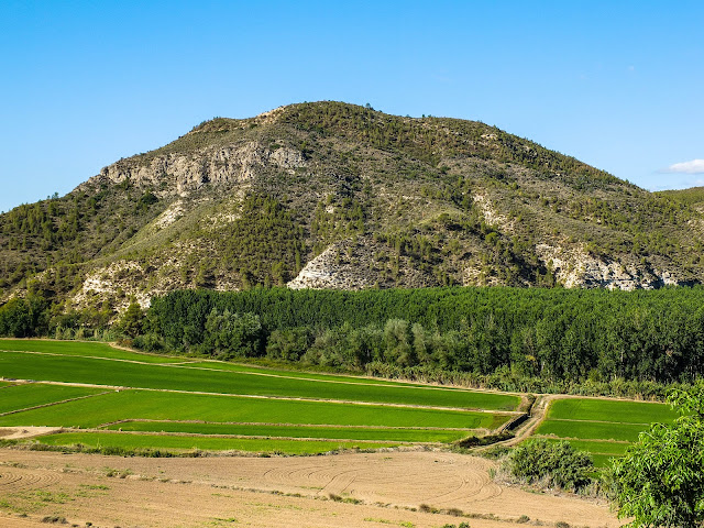 Han pasado algunos días desde mi visita a las casacuevas de Las Minas y otros vestigios azufreros que me pillaron al paso y vuelvo a las andadas con la intención de seguir disfrutando de los tesoros paisajísticos que tenga a bien ofrecerme esta sorprendente comarca y para ello tengo pensado darme un paseo por un camino que discurre paralelo a la acequia de Salmerón con dirección a la junta de los ríos Segura y Mundo y de esta manera, plantarme a pie de campo, en los inmensos arrozales que se extienden por ambas márgenes del río Segura. Visto lo visto, atisbo que la cosa promete porque los sembrados lucen estos días de un resplandeciente color césped Bernabeu que cautiva, así que tengo la impresión de que los bonitos paisajes con que seguir alimentando este blog los tengo más que asegurados. Pero antes, me gustaría coronar el Monegrillo y nada más pintar el día, he puesto rumbo hacia Salmerón. He visto en la cartografía una pista que con orientación suroeste me deja muy cerquita del comienzo de ascensión y hacia ella sin más dilación me encamino. Fotografías tomadas antes de llegar a la pedanía de Moratalla y aspecto de la vertiente que evolucionando por el SUR (derecha de la imagen), atacaremos el tramo final por su OESTE (plano frontal de la imagen). Ya se infiere que habremos de trepar unos metros para coronar.