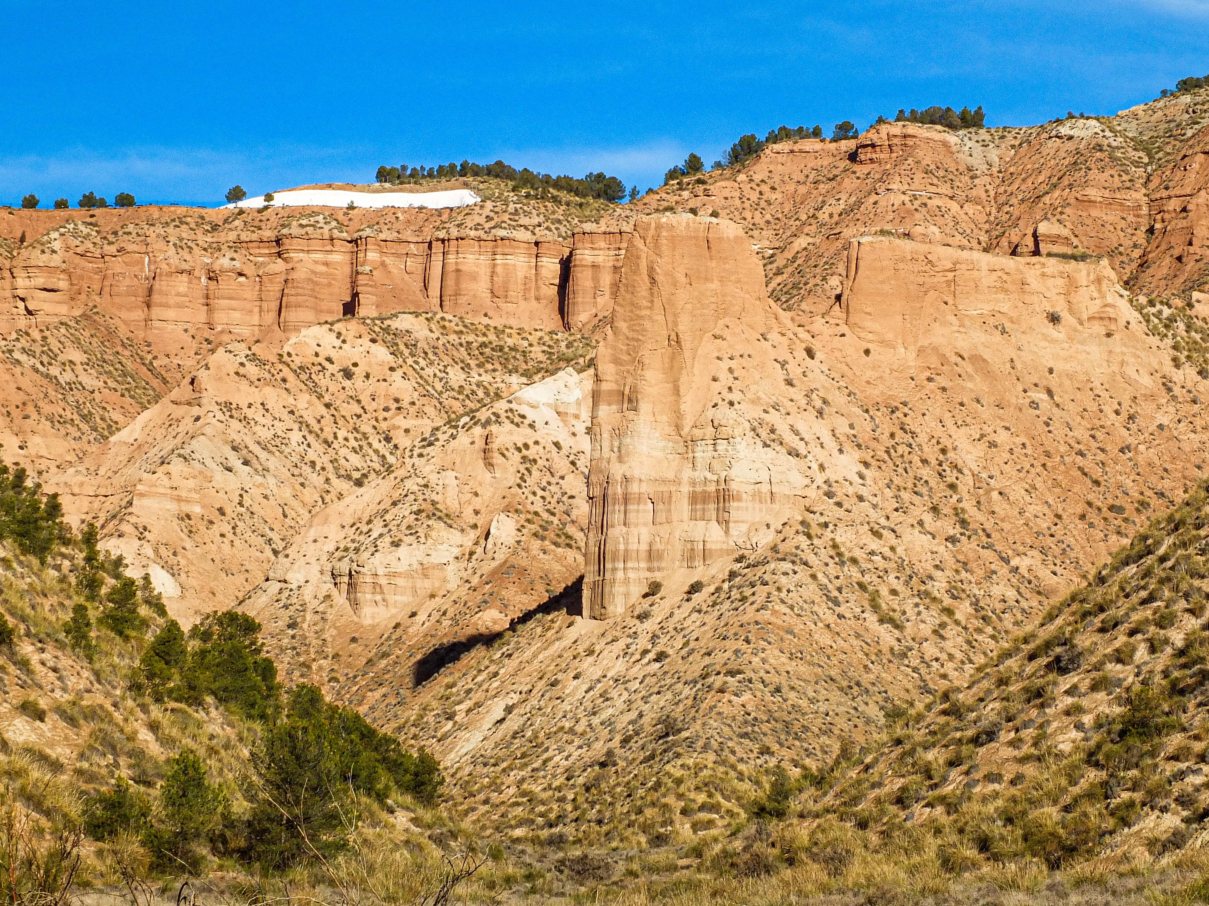 Ya estamos caminando sobre el ancho lecho de la rambla, y como hace tiempo que no llueve, el terreno se presenta firme. Observo a mi izquierda unas formaciones monumentales, bastante verticales, que llaman poderosamente mi atención. Me salgo del sendero unos cientos de metros, para acercarme un poquito más y fotografiarlas.